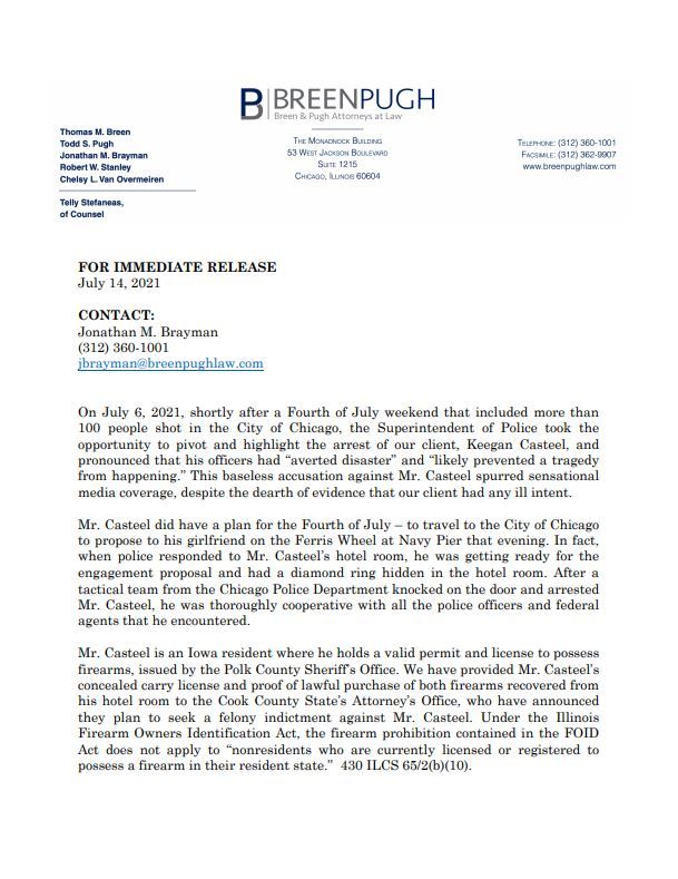 CHICAGO - The law firm of Breen & Pugh, located in Chicago, has released a statement announcing themselves as lead counsel in the defense of Keegan Casteel. Mr. Casteel is the 32-year-old Iowa man arrested and charged with Aggravated Unlawful Use of a Weapon in the W Hotel over Independence Day weekend.