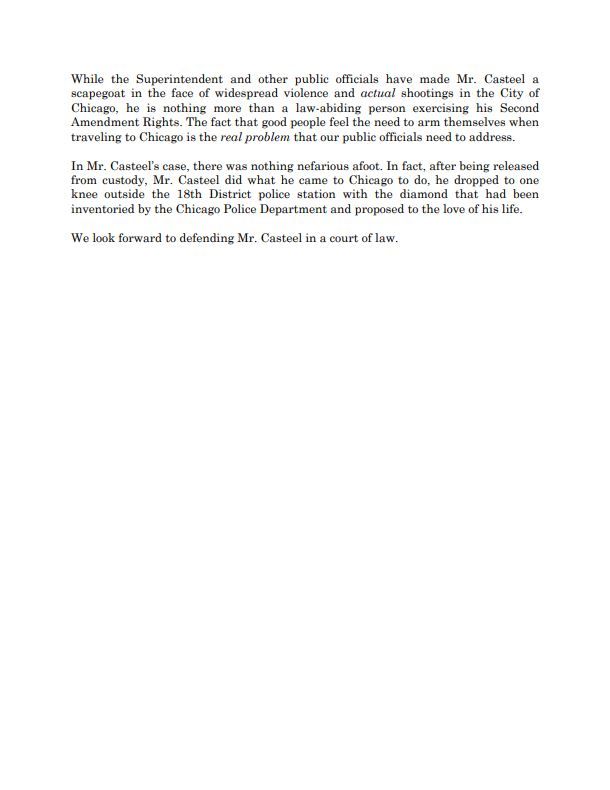 "In Mr. Casteel’s case, there was nothing nefarious afoot. In fact, after being released from custody, Mr. Casteel did what he came to Chicago to do, he dropped to one knee outside the 18th District police station with the diamond that had been inventoried by the Chicago Police Department and proposed to the love of his life. We look forward to defending Mr. Casteel in a court of law."