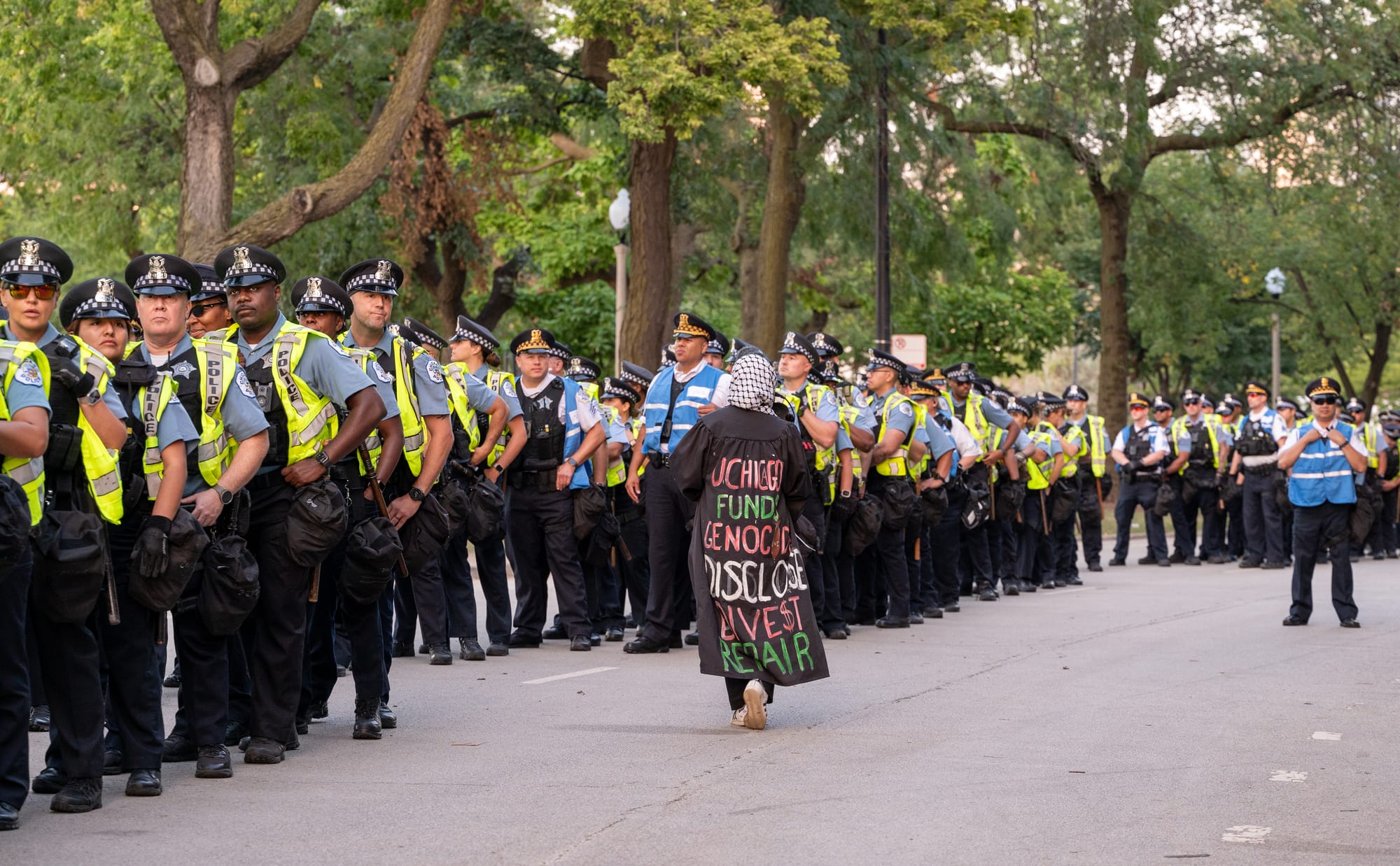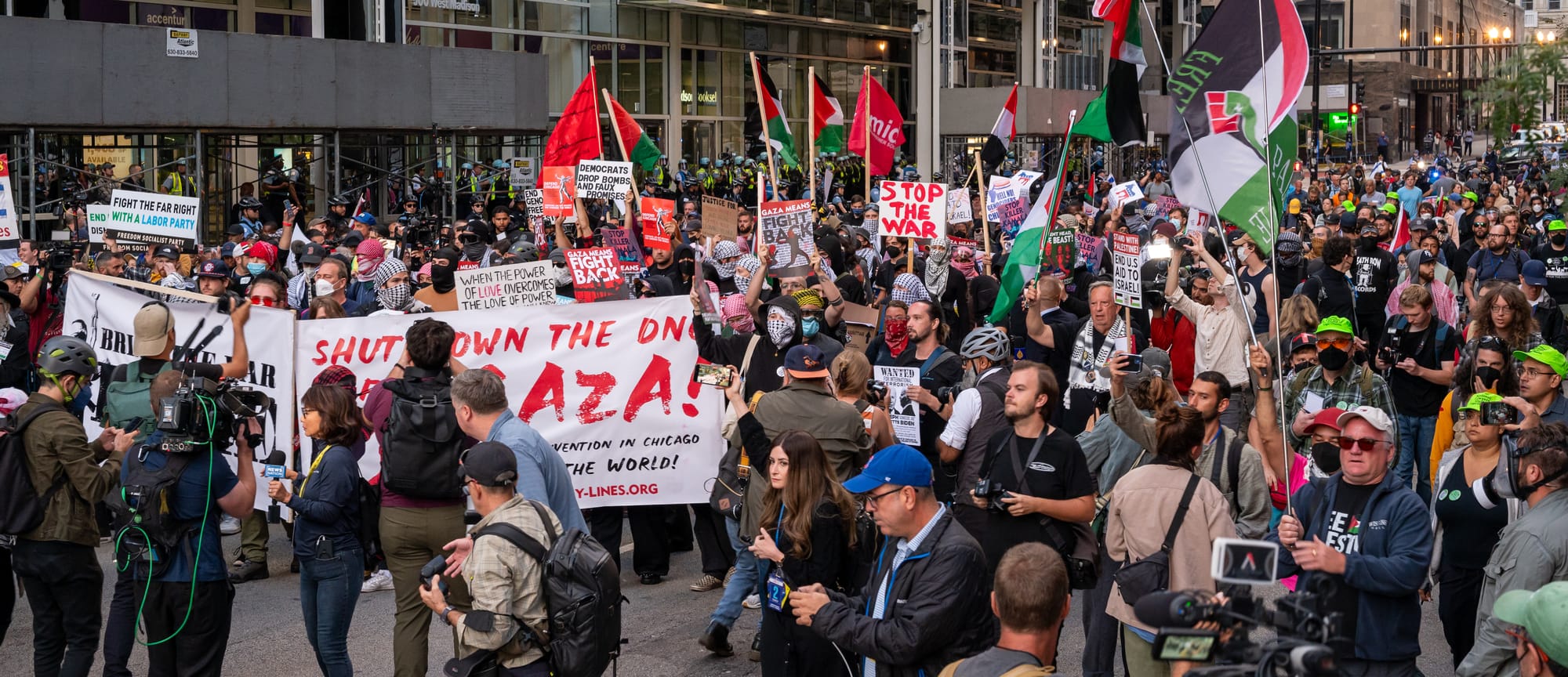 In August 2024, as the Democratic National Convention took place in Chicago, protesters gathered in the streets to voice their opposition to the ongoing conflict in Gaza and U.S. foreign policy. This gallery captures moments from those protests.